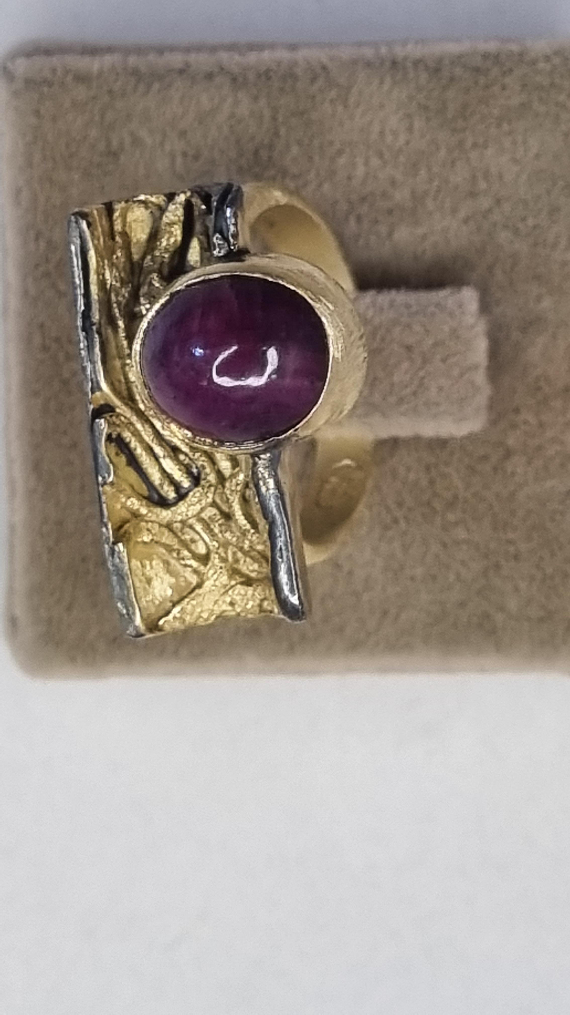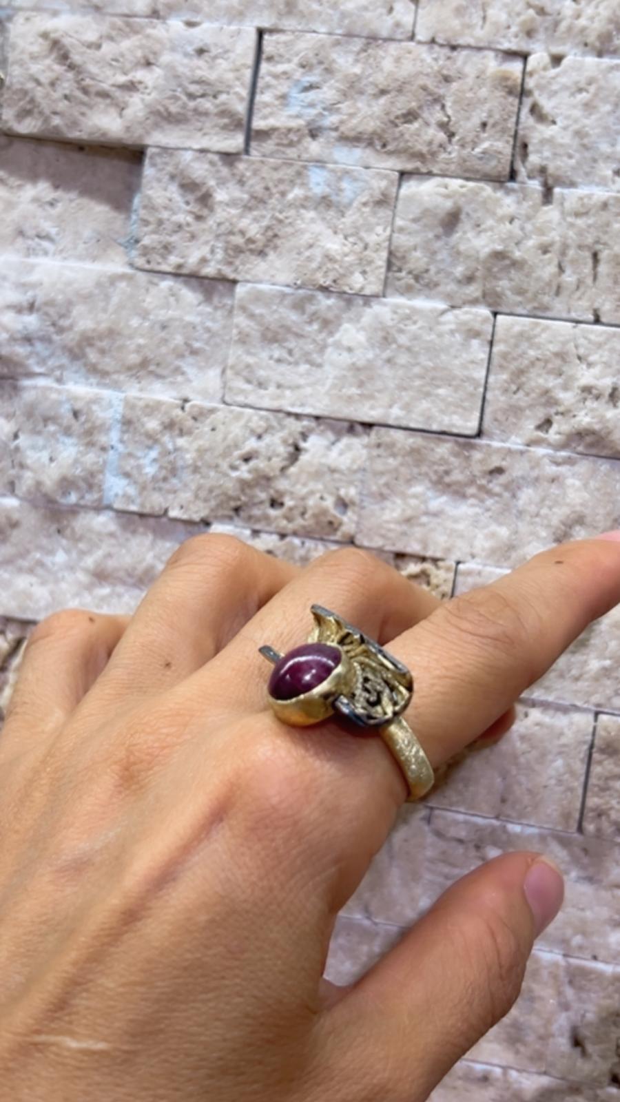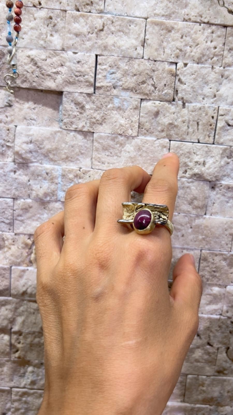 Örgü dokusunu andıran el işçiliği detayları ve merkezindeki canlı taş ile dikkat çeken özel tasarım. 925 ayar gümüş üzeri altın kaplama yapısıyla şıklığı ve gücü bir arada sunar.