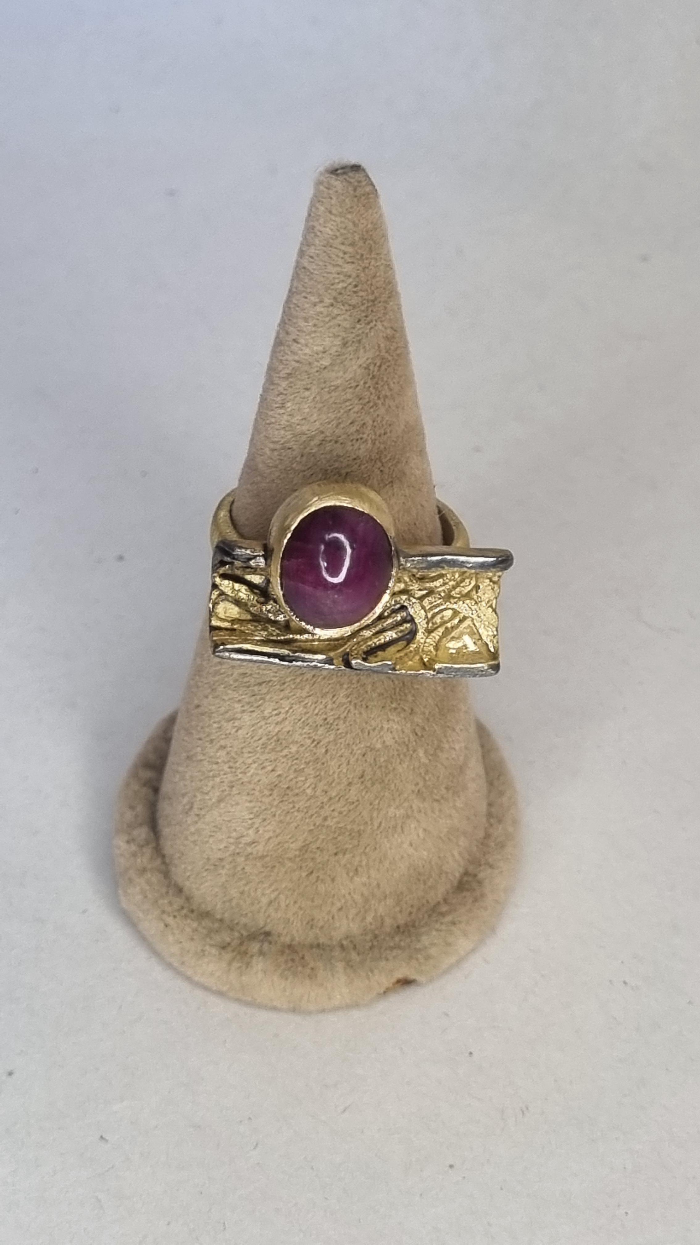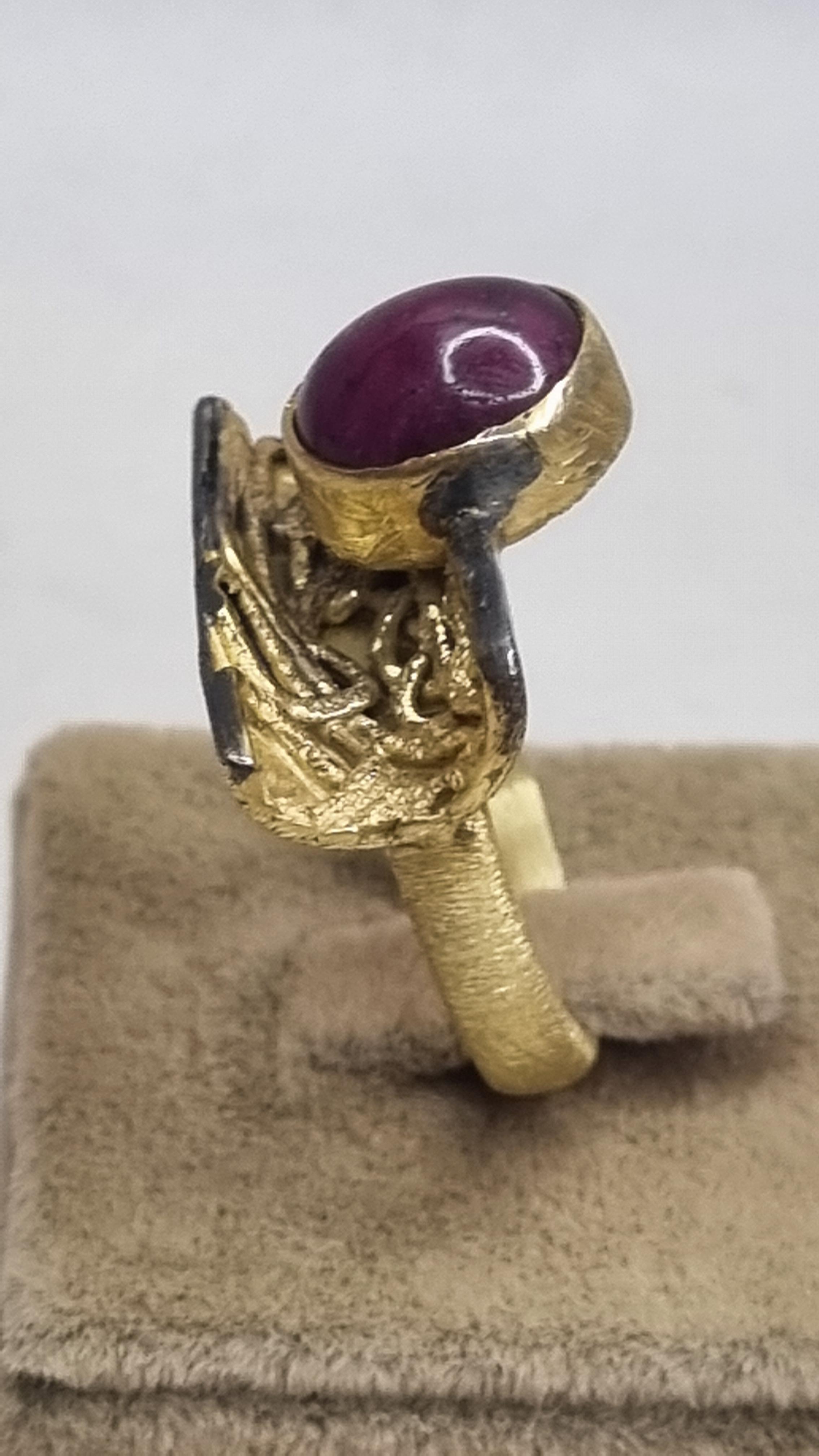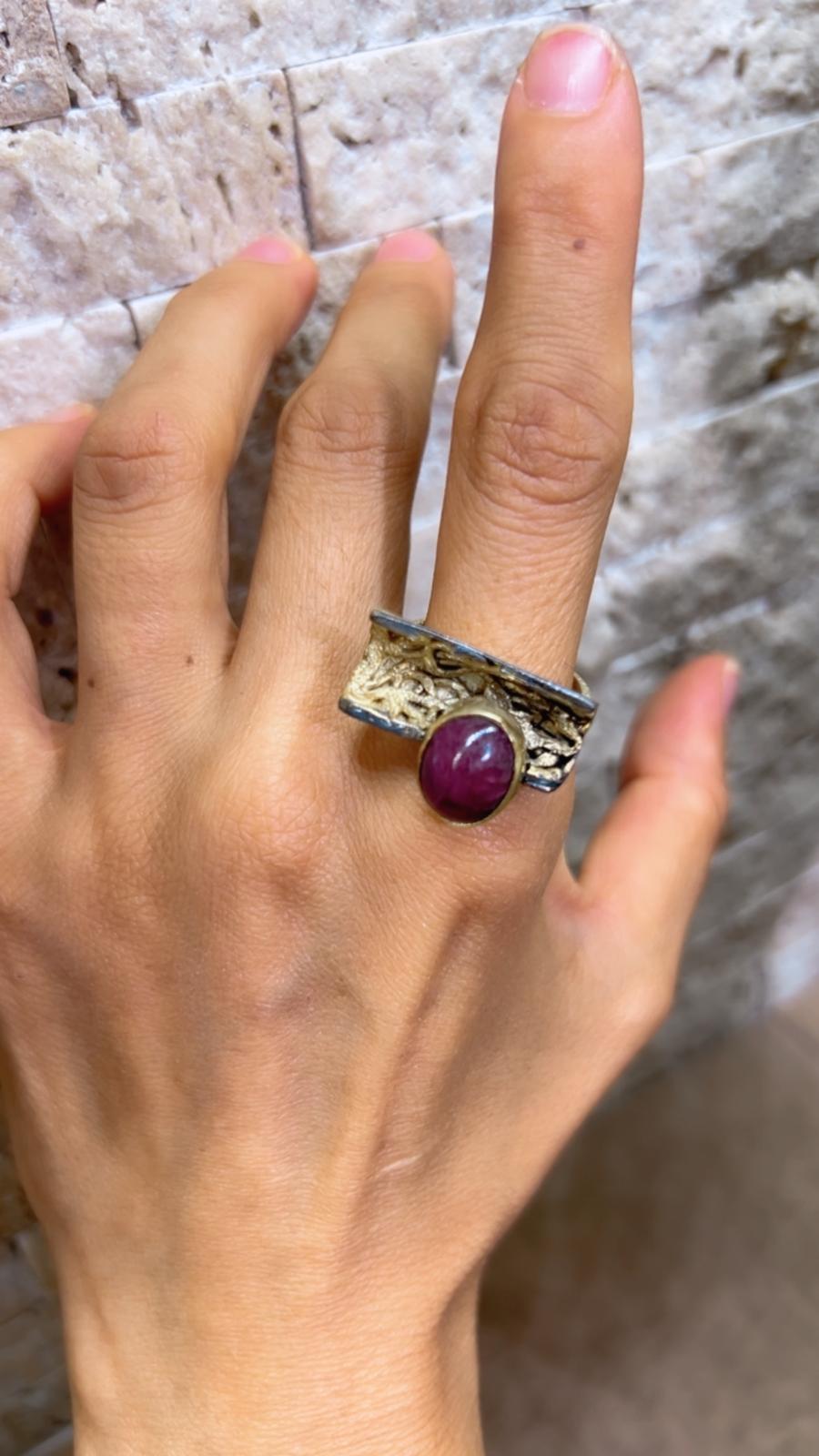 Örgü dokusunu andıran el işçiliği detayları ve merkezindeki canlı taş ile dikkat çeken özel tasarım. 925 ayar gümüş üzeri altın kaplama yapısıyla şıklığı ve gücü bir arada sunar.