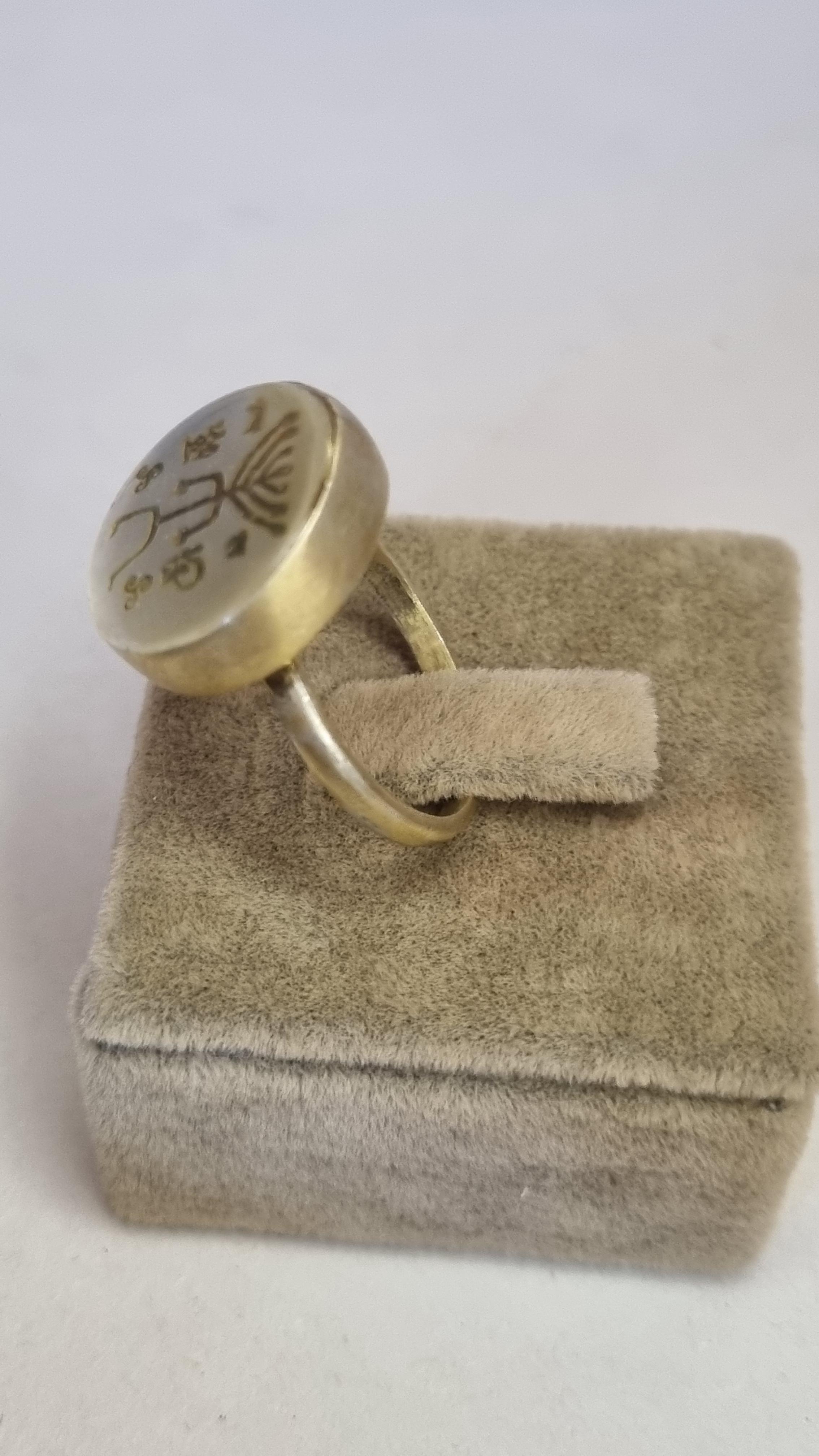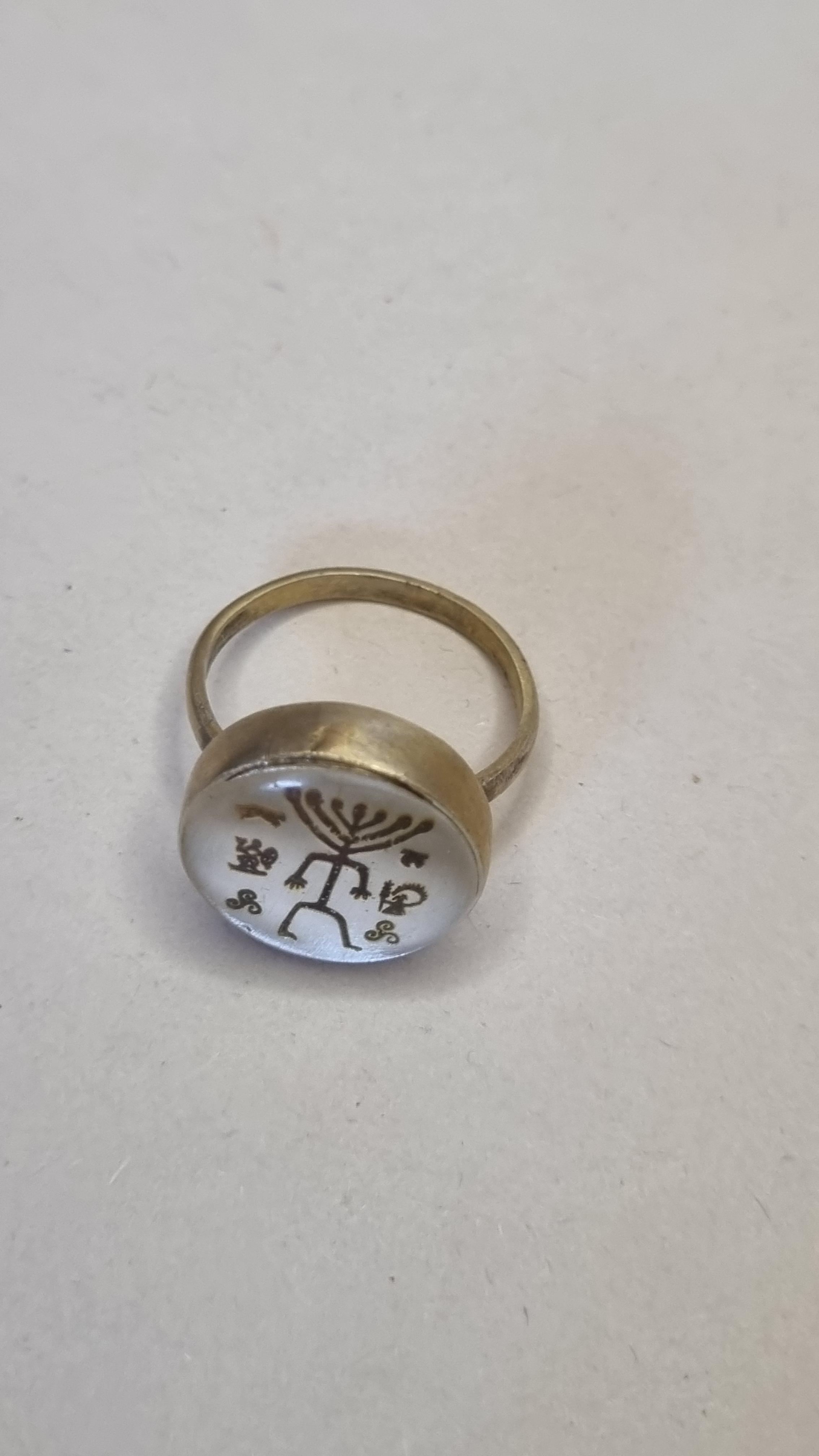 Şaman kültüründen esinlenerek tasarlanan bu özel yüzük, epoksi kaplama ile korunmuş mistik semboller taşır. İstenirse Epoksisiz 925 ayar gümüş olarak sade şekilde de olabilir. Ölçü ve boyutlar kişiye özel hazırlanır.